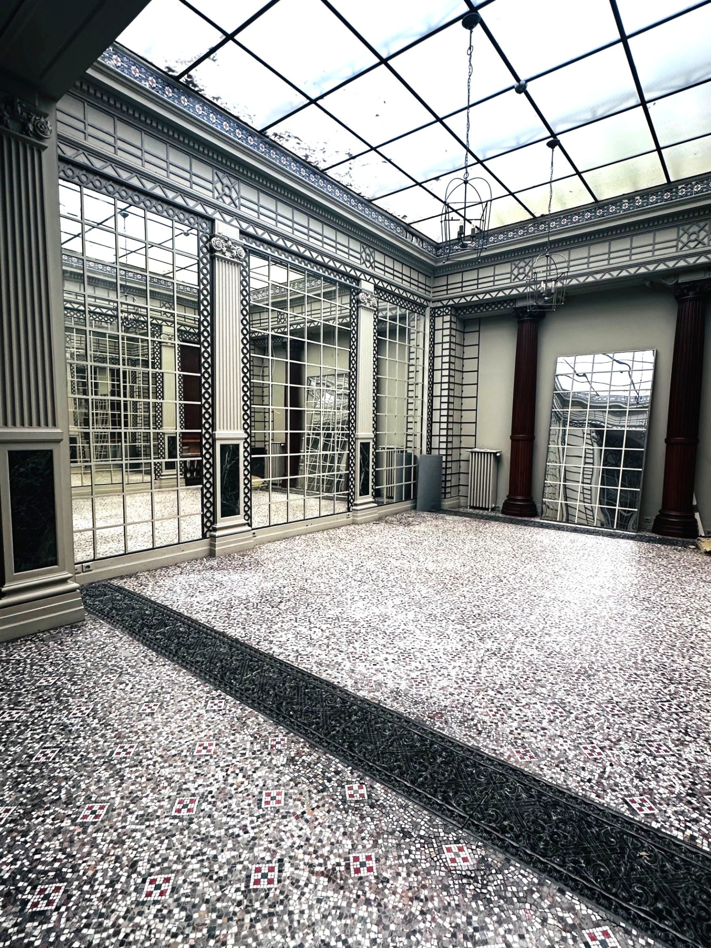 D’une verrière intérieure majestueuse, ornée de miroirs – un espace à la fois lumineux et théâtral, idéal pour recevoir ou se détendre,