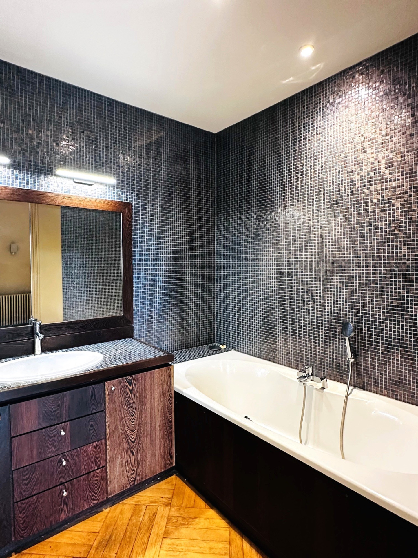 D’un séjour aux volumes spectaculaires, sublimé par de belles hauteurs sous plafond et un parquet en point de Hongrie qui rappelle les intérieurs parisiens les plus raffinés,