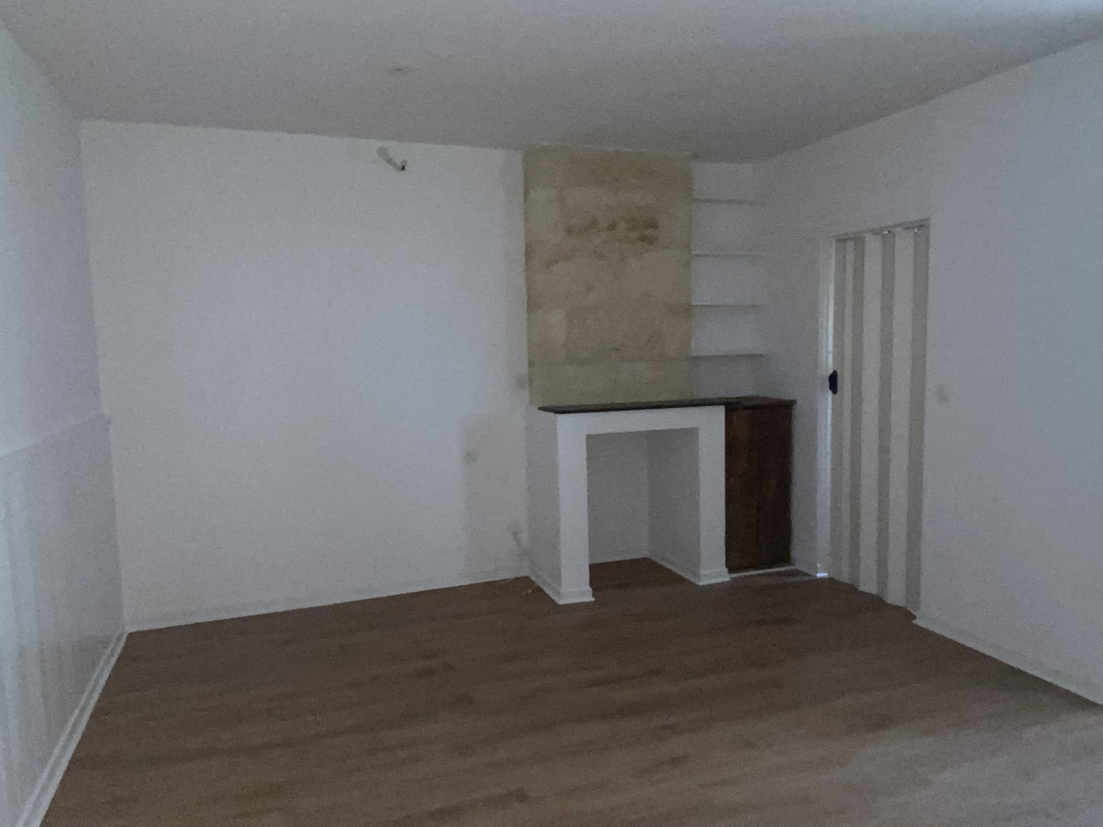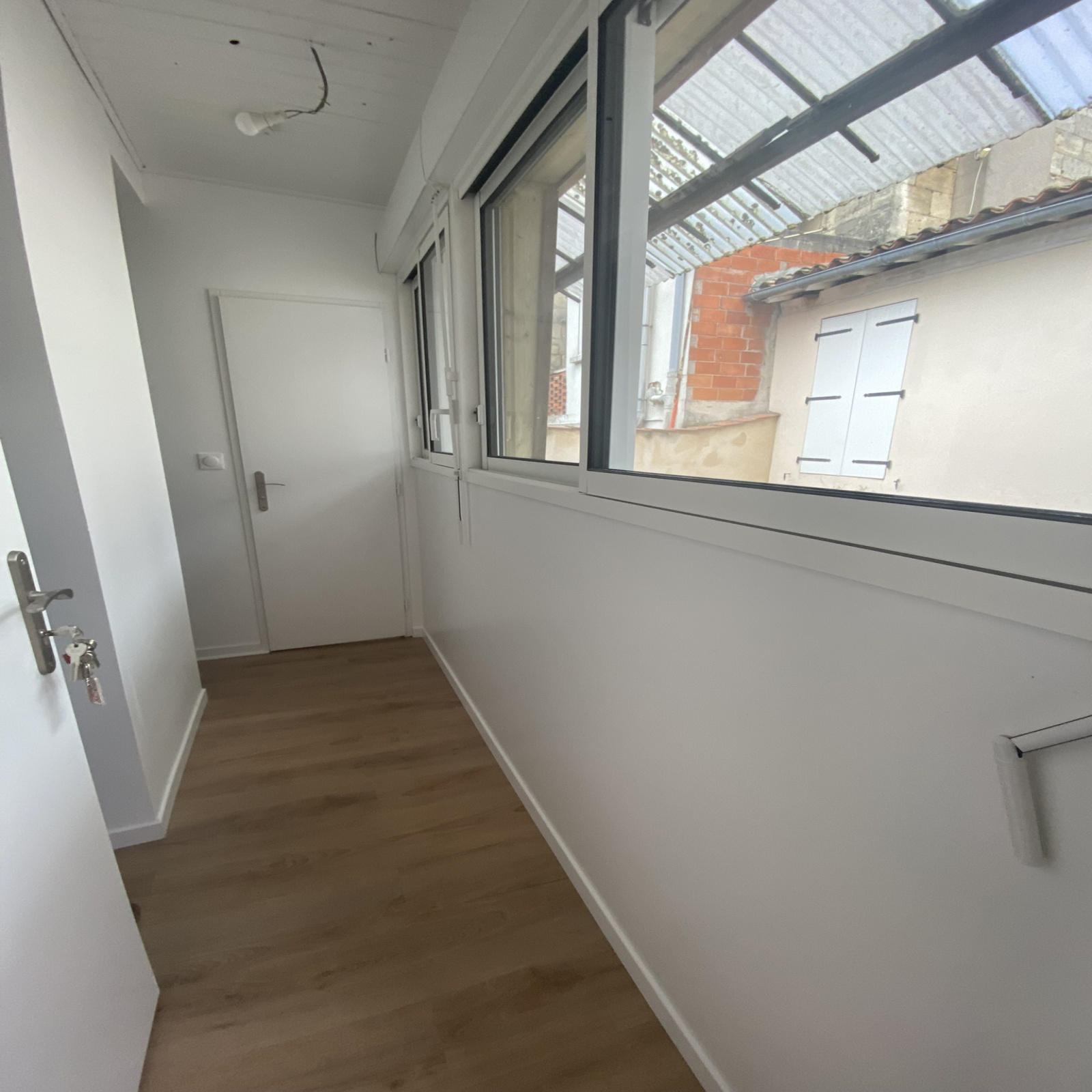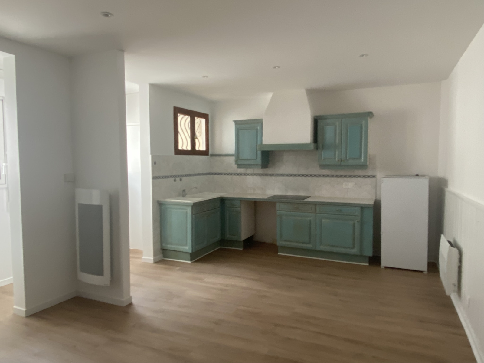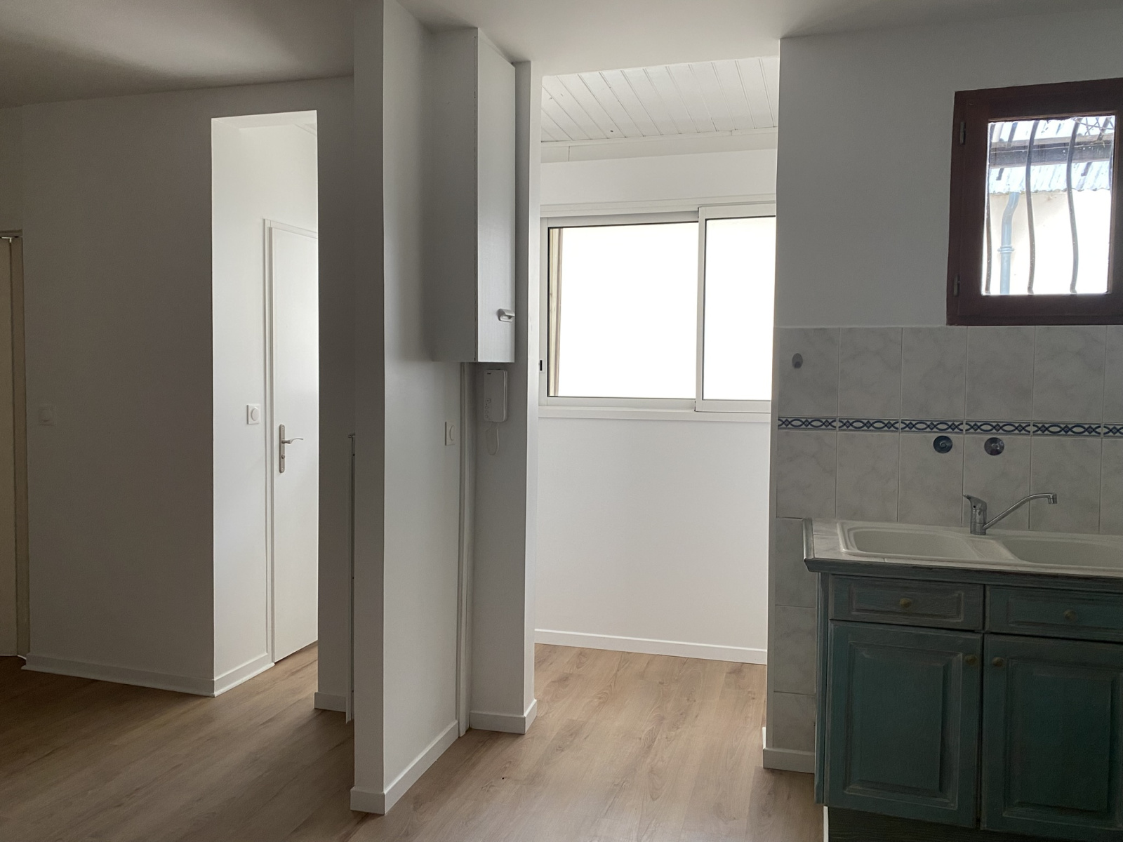 T1 d'environ 29m² composé d'une entrée par petite véranda, une cuisine aménagée et équipée (four, plaques induction, hotte, frigo) table et chaises, séjour, salle d'eau avec WC.